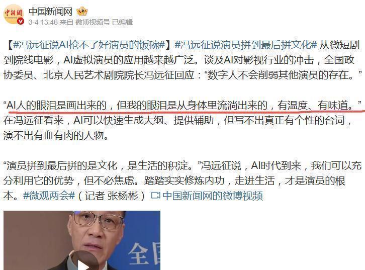 在2026年两会期间,全国政协委员冯远征说:“AI 咱们画出来的眼泪,而我流出的眼泪,是从身体里流出来的,有温度,也有味道。”