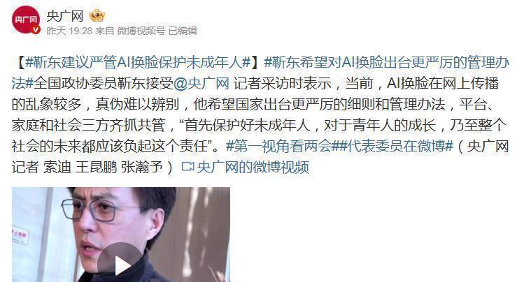 靳东提醒,AI换脸这种技术千万别用在未成年人身上,也不要让未成年人被骗去。